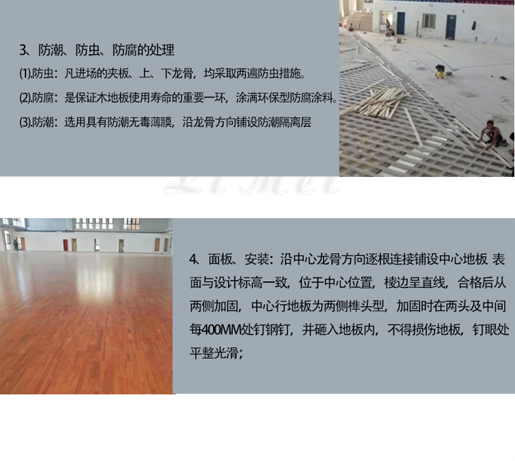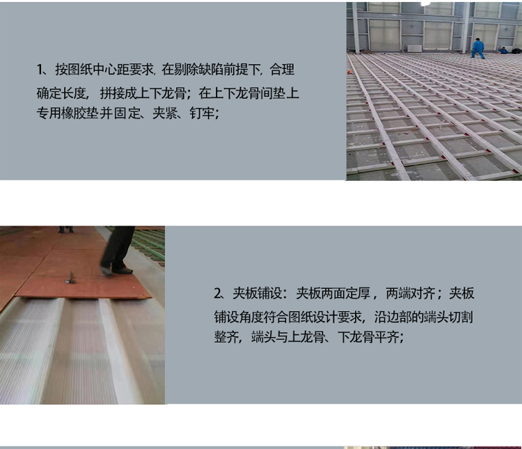 面板介绍: | 专业运动木地板,参照德国DIN标准,结构标高100mm完全满足运动木地板的保护功能、运动功能、技术功能,适用于各类教学训练、表演等。 | ||
