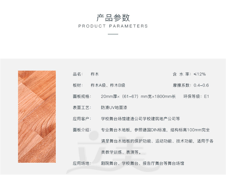 面板介绍: | 专业运动木地板,参照德国DIN标准,结构标高100mm完全满足运动木地板的保护功能、运动功能、技术功能,适用于各类教学训练、表演等。 | ||