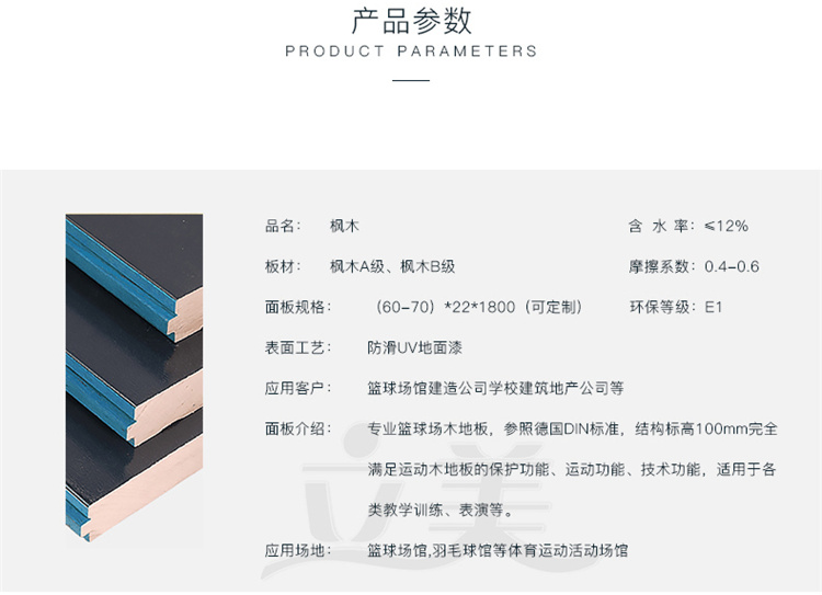 面板介绍: | 专业篮球场木地板,参照德国DIN标准,结构标高100mm完全满足运动木地板的保护功能、运动功能、技术功能,适用于各类教学训练、表演等。 | ||
