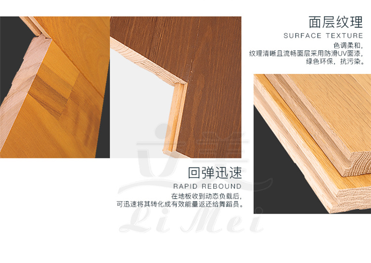 另外,舞蹈教室专用木地板选材来源于大自然实木木种,具有耐磨防滑的功能,并且其独有特色——环保特性是其他地板多达不到的,运动木地板木纹理靓丽,有着天然的木种香气,这也是为什么现今舞蹈教室木地板特别受欢迎的重要原因。