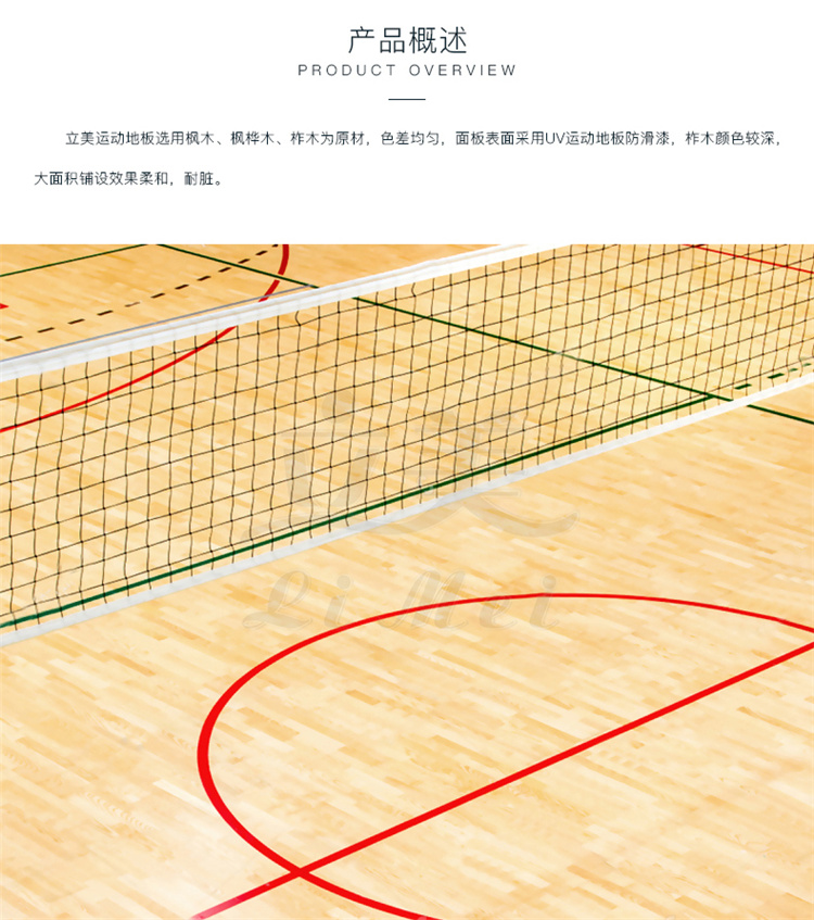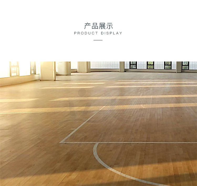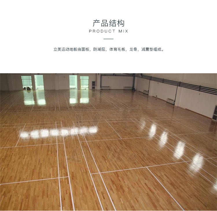 面板介绍: | 专业篮球场木地板,参照德国DIN标准,结构标高100mm完全满足运动木地板的保护功能、运动功能、技术功能,适用于各类教学训练、表演等。 | ||