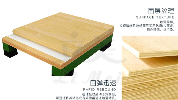 减震:运动木地板最关键的作用---吸收冲力、形成缓冲,避免运动员落地时受地面反作用力而引起的伤害,减少受伤的危险。