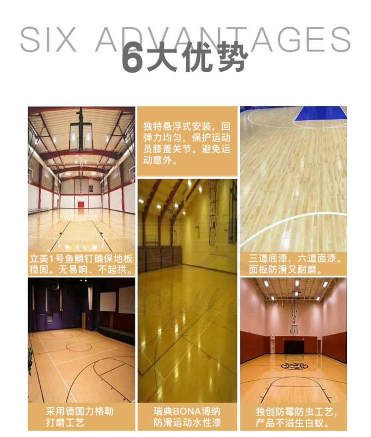 篮球馆专用木地板大多都用枫木、柞木为面料制作的,他们的木质软硬适中、变形量微,而且属于长纤维结构的树种,不易出现毛刺,可减少对运动员皮肤的伤害。运动木地板的下面的结构主要起到减震,吸震作用,当运动者高度运动落地是,运动木地板能大量吸收大量的力,从而是身体受到保护,尤其是脚踝和膝盖。