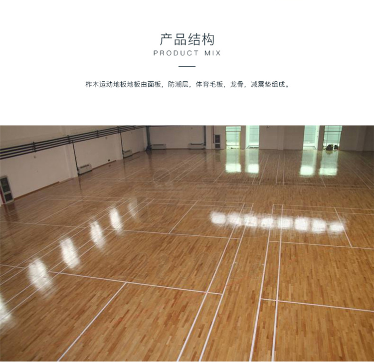 面板介绍: | 专业篮球场木地板,参照德国DIN标准,结构标高100mm完全满足运动木地板的保护功能、运动功能、技术功能,适用于各类教学训练、表演等。 | ||