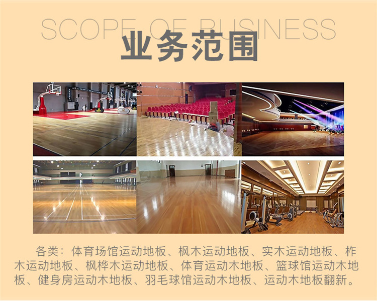 悬浮式体育运动木地板应用与篮球场、羽毛球场、排球场、舞蹈室等运动活动场所。