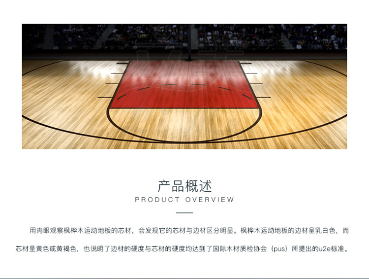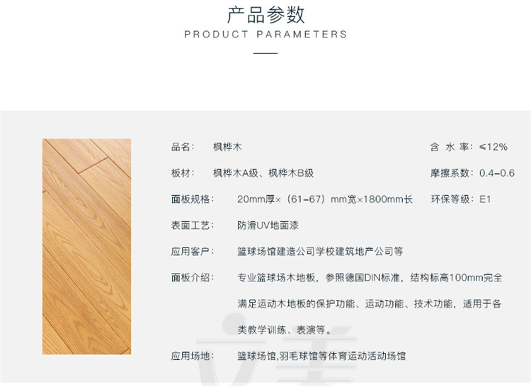 | 面板介绍: | 专业篮球场木地板,参照德国DIN标准,结构标高100mm完全满足运动木地板的保护功能、运动功能、技术功能,适用于各类教学训练、表演等。 | ||||