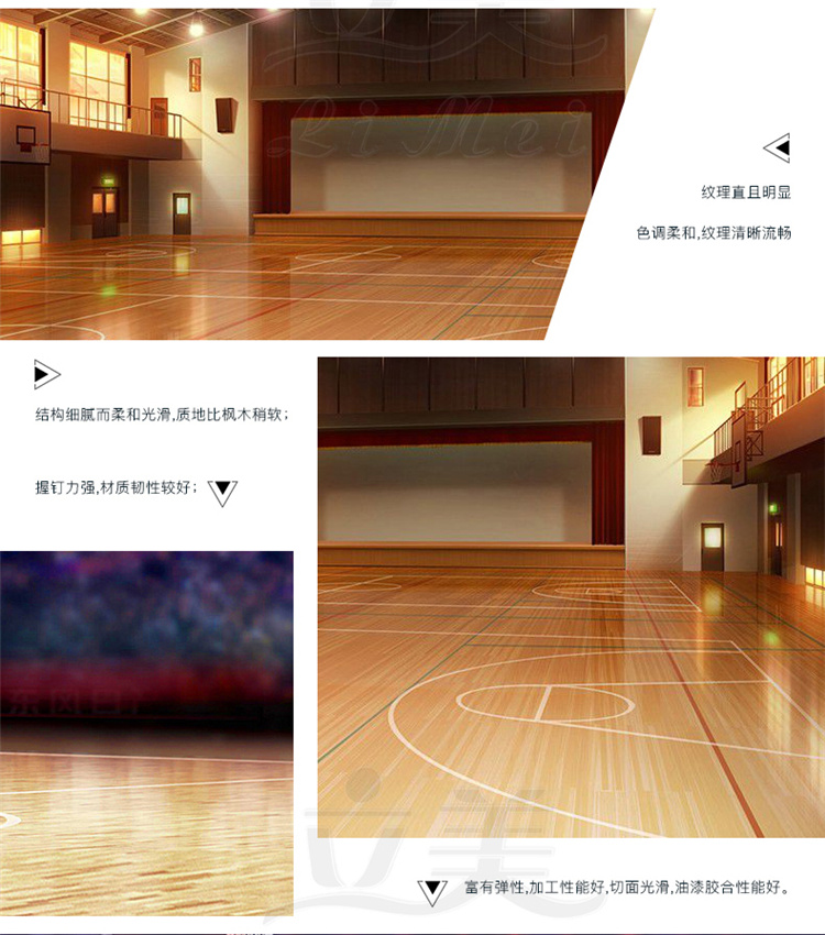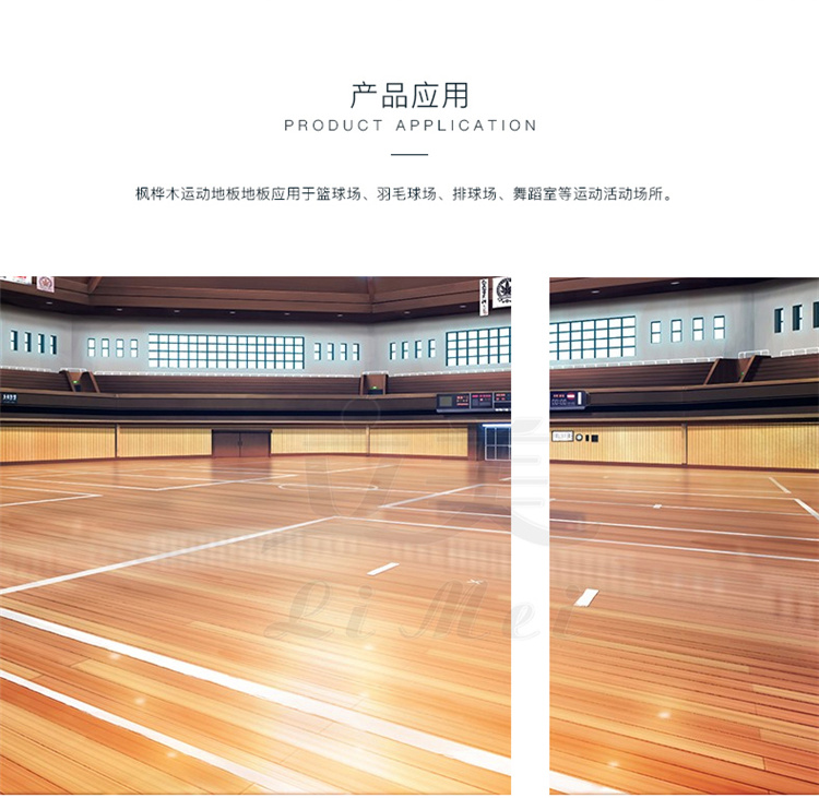 枫桦木运动地板地板应用于篮球场、羽毛球场、排球场、舞蹈室等运动活动场所。