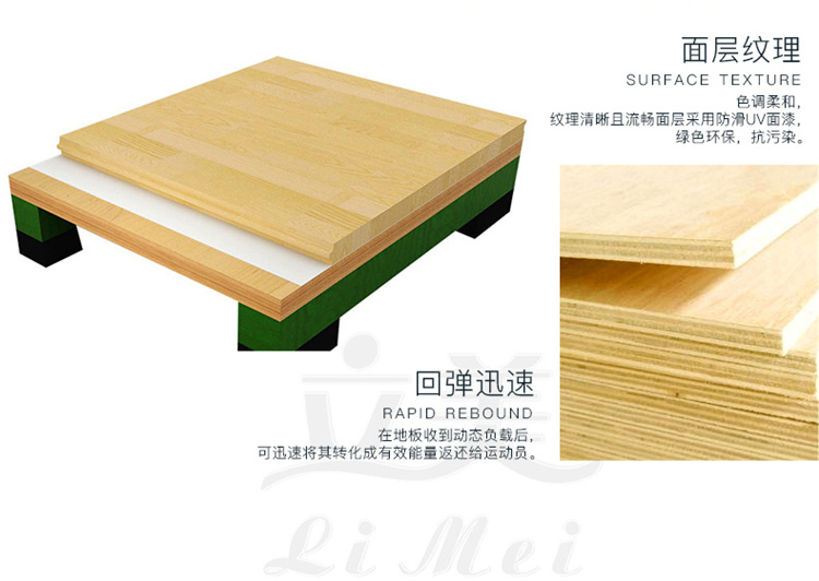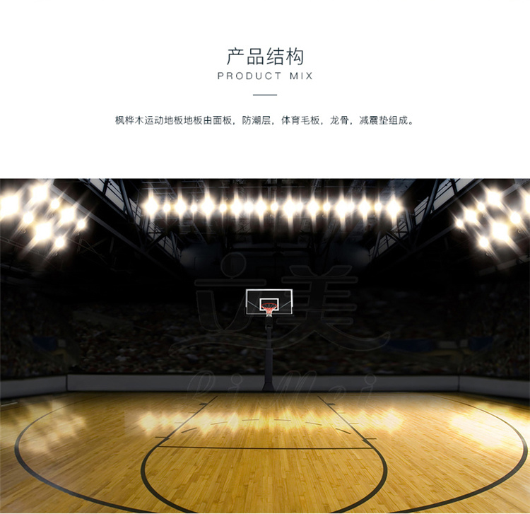 枫桦木运动地板地板由面板,防潮层,体育毛板,龙骨,减震垫组成。